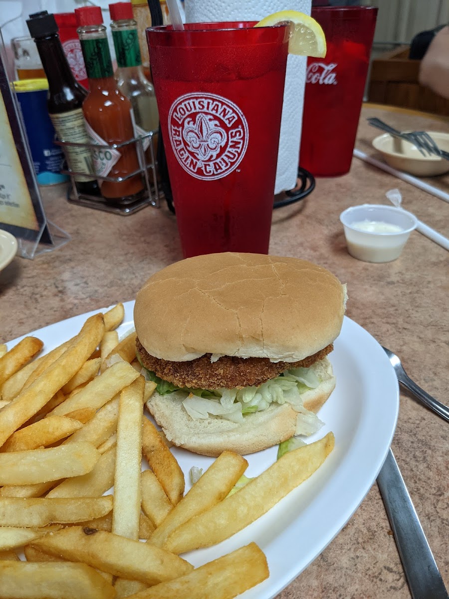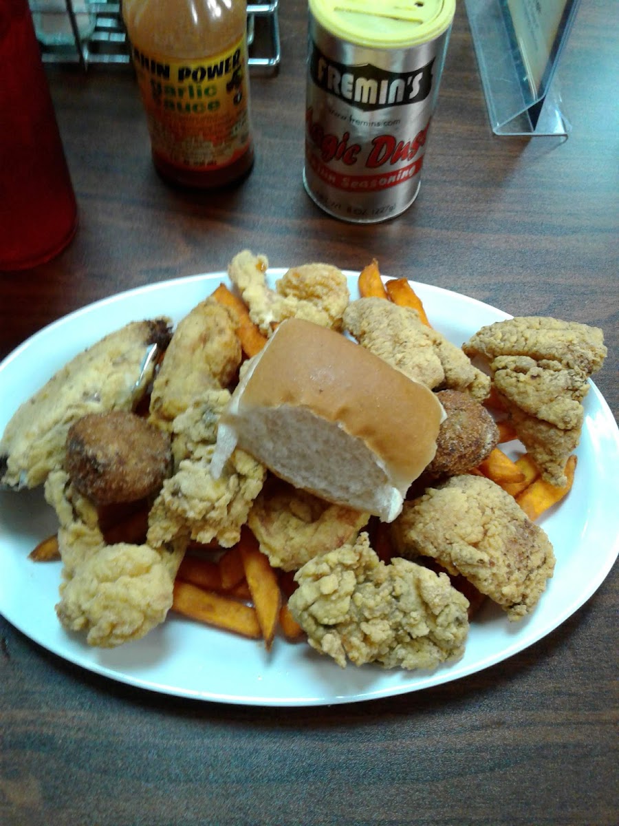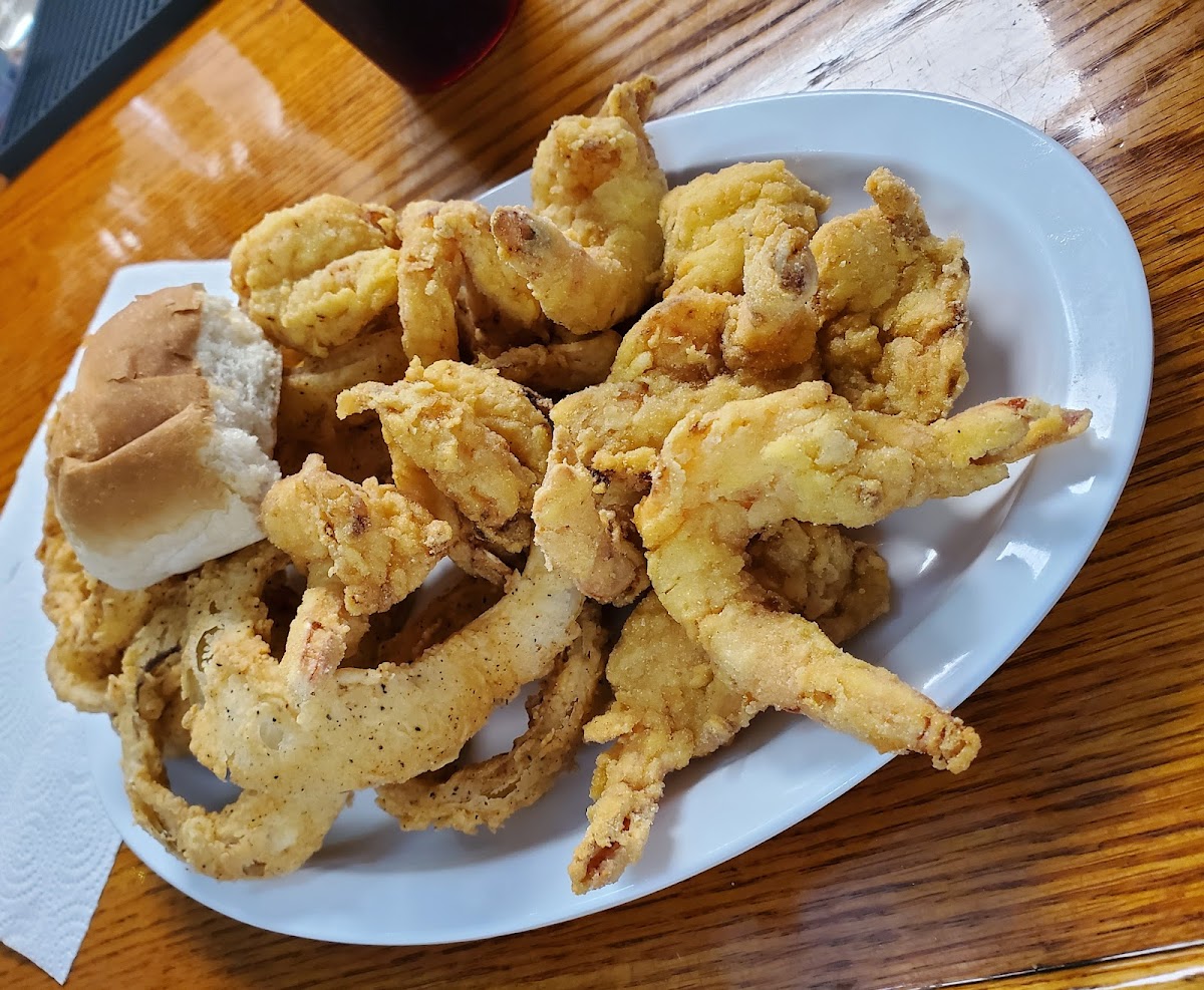 Beautiful day to sit by the bayou and enjoy some good Cajun food. I tried the seafood platter to try a little everything... Shrimp, frog leg, fried oyster and catfish. Shrimp was excellent and the rest was good. My wife enjoyed her Caesar salad with grilled shrimp. We went for an early dinner (4:30pm) and Nora was working alone till night crew arrived. Despite being very busy she did a marvelous job juggling between bartending, taking and delivering orders and bussing tables.