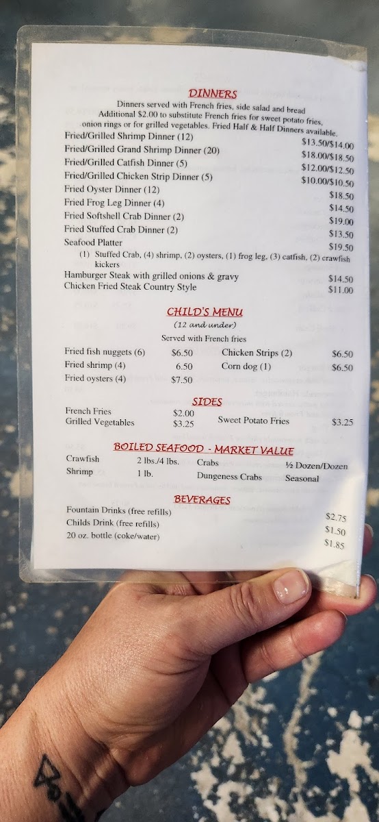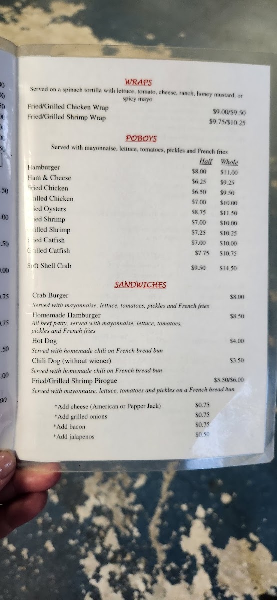 Guests can expect hearty plates like the Seafood Platter and Shrimp Platter that showcase fresh, local flavors. Alongside these are familiar favorites such as the Crab Burger and PO’ Boy sandwiches, as well as crispy Fried Pickles and Homemade Onion Rings that make ideal snacks or accompaniments. The menu also includes lighter options like the Grilled Shrimp Caesar Salad, balancing richness with freshness.