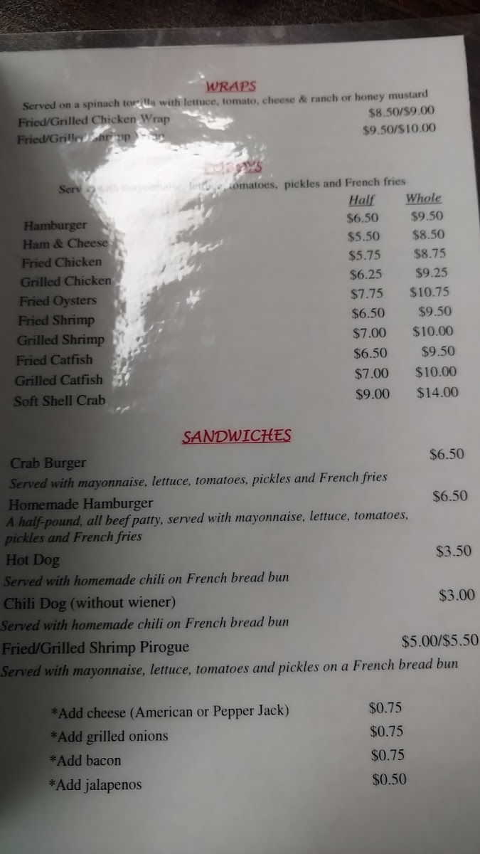 Pelicans On the Bayou offers a menu rooted in classic bar and grill fare with a focus on Cajun-inspired seafood and comforting Southern dishes. The selection is straightforward and approachable, perfect for those seeking casual, satisfying meals whether it’s a midday lunch or a relaxed dinner by the water.